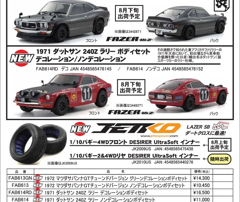 京商株式会社はKYOSHO RC Information FAZER 1972マツダサバンナ & 1971ダットサン240Zラリーボディを発表しました。