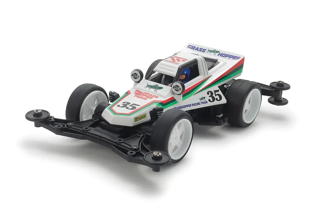 RCグラスホッパーの登場から40年、ついにミニ四駆バージョンが登場する。シングルシーターバギーをイメージした直線構成のスリムなボディは、シンプルながらスピード感あふれる造形で、ホワイトのボディにグリーンとレッドのラインが入ったカラーリングもRCのイメージそのまま。シャーシは小型・軽量・ショートホイールベースのVZを採用。