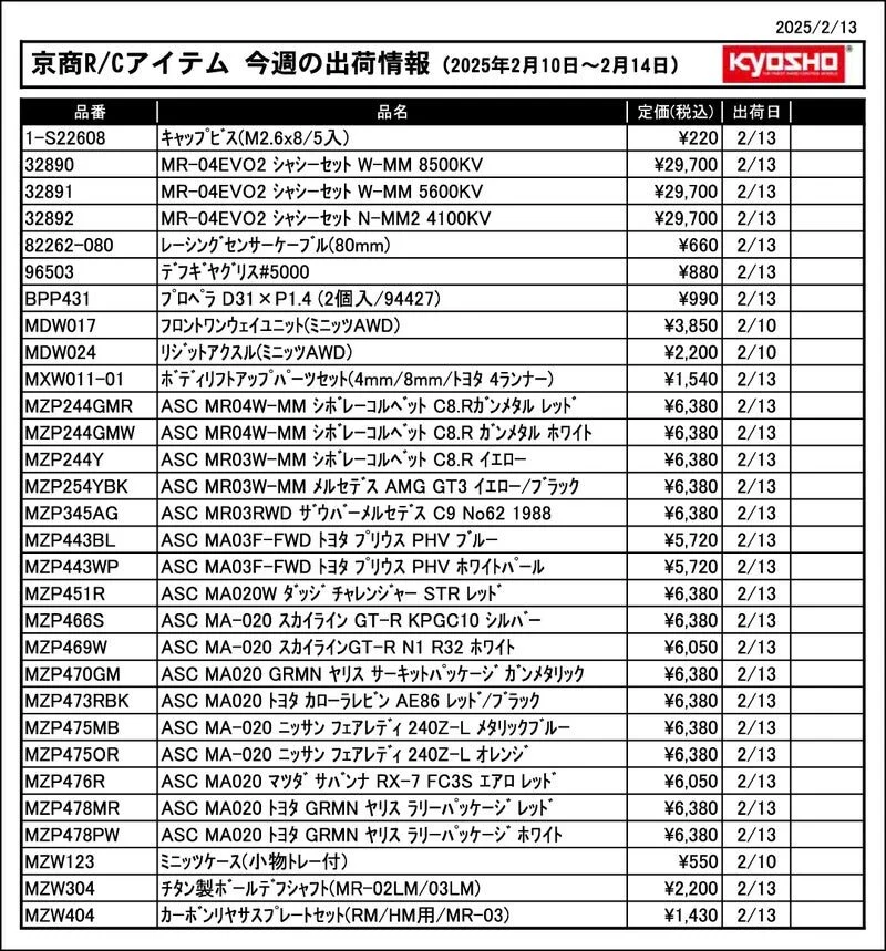 YOSHO RC Information 今週の出荷情報(2025年2月10日~2月14日)