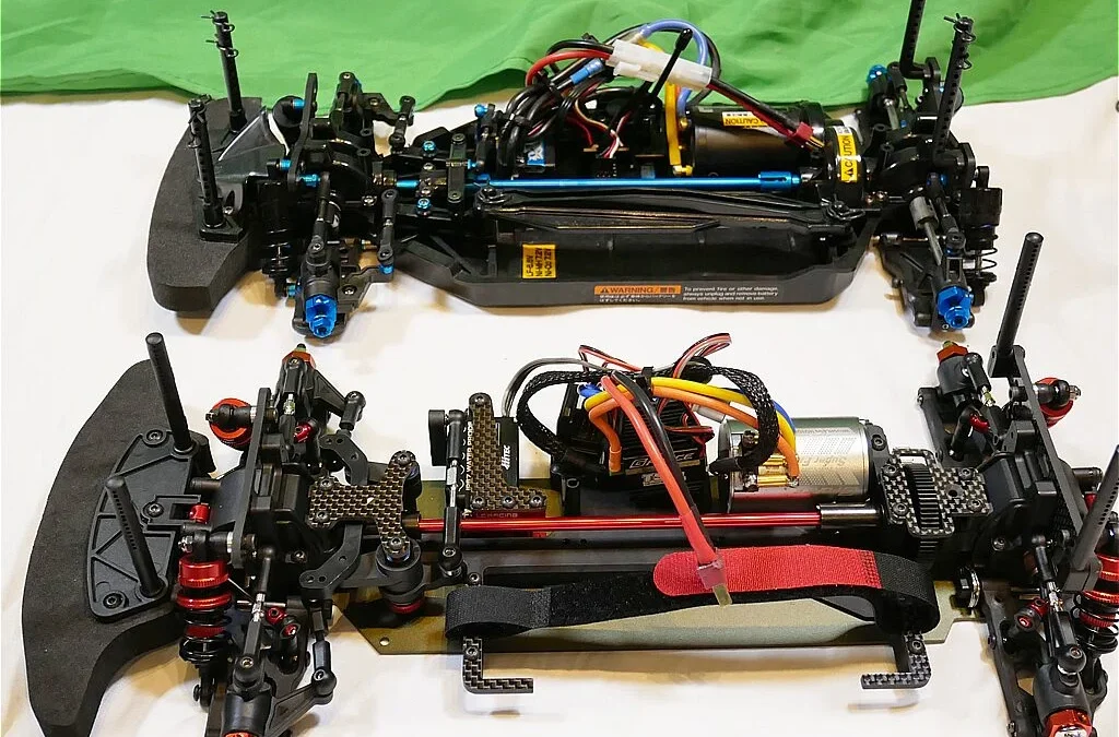 PTG-2TCとTT-02 Type SRXを並べてみました。レッドとブルーが対比的ですが、ぱっと見の印象が非常に似ていることがわかります。ある意味で成熟しつくした構成ではありますので最適解が同じになっていくのはツーリングカージャンルの特長とも言えますね。なお、シャーシについてはジュラルミン+樹脂補強のPTG-2TCと樹脂バスタブのTT-02 Type SRXという違いがあります。