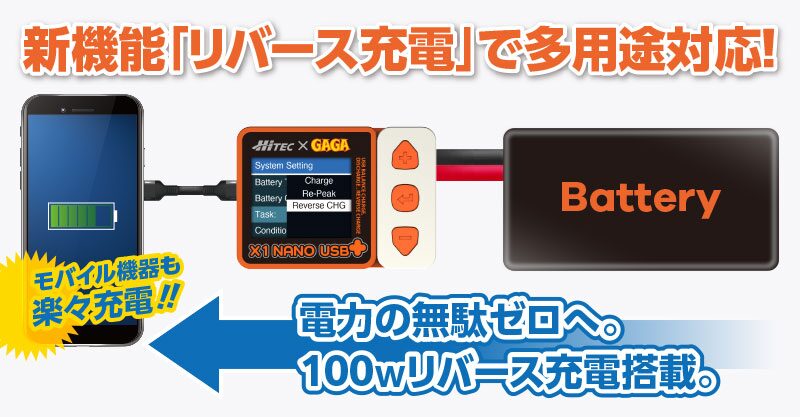従来の機能に加え、「リバース充電」の搭載でRC用バッテリーなどを電源とし、Type-C経由でスマートフォンやタブレットなどのモバイルデバイスへ100Wの給電することが可能。