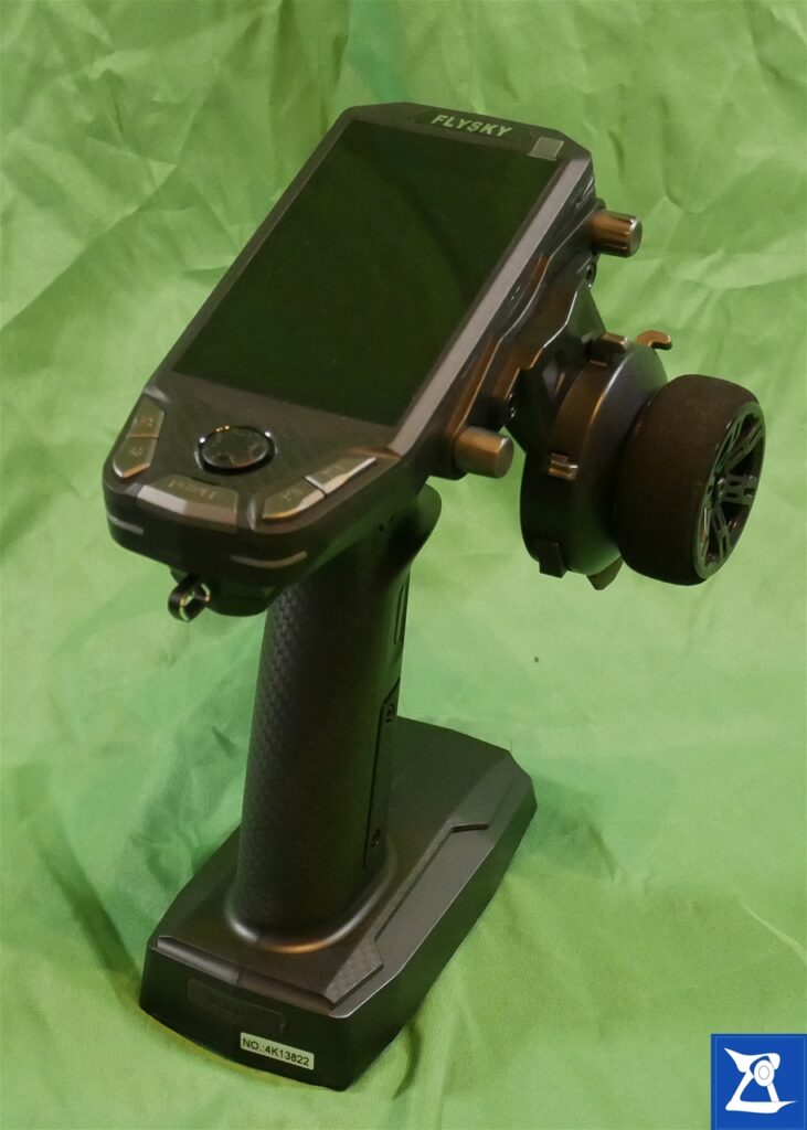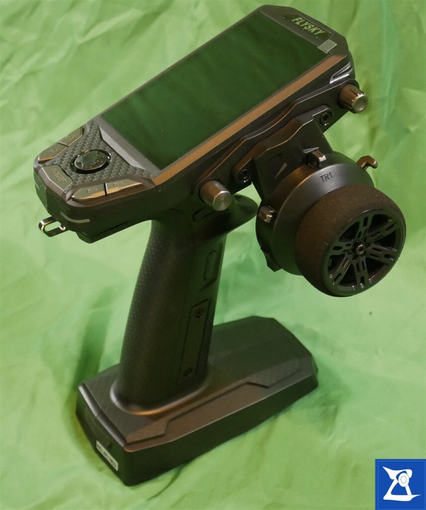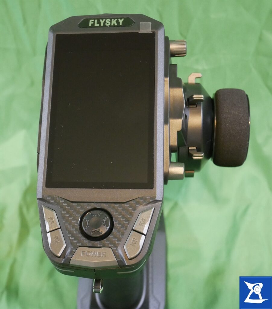 プロポ本体です。ディスプレイはタッチ式ではないので中央の方向キーと電源キー、左右にファンクションキーにあたるボタンが4つ配置されています。ステアリングホイールやトリガー部分は調整式となっており、11ch送信機ということもあり各種スイッチがステアリングホイールの周辺に多く配置されています。これらには自由にチャンネルを割り当てることができます。画面の言語は英語と中国語対応となっており、代理店である流星株式会社様に確認したところ日本語モードを搭載したファームウェアをFlysky社と連携して準備中とのことです。