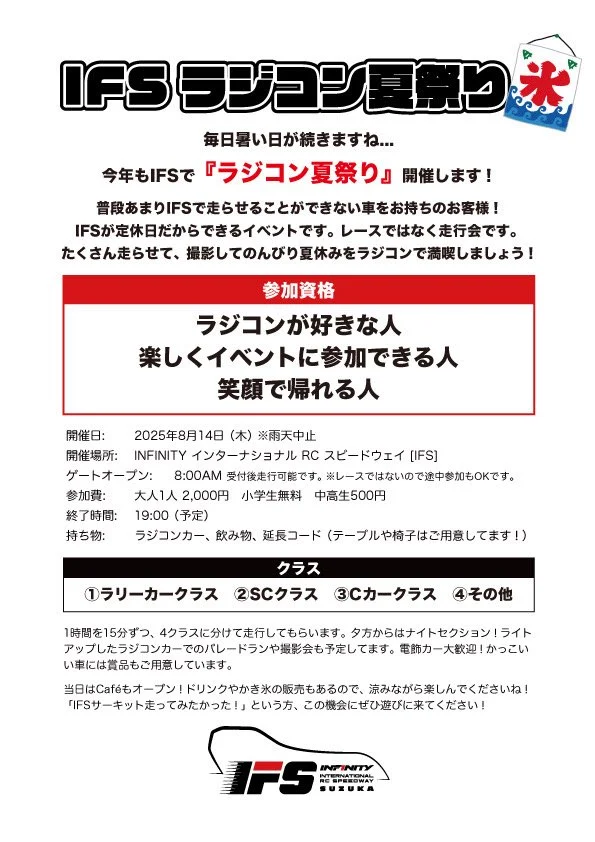 2025年8月14日に三重県 IFSにて「IFSラジコン夏祭り」が開催されることが発表された。