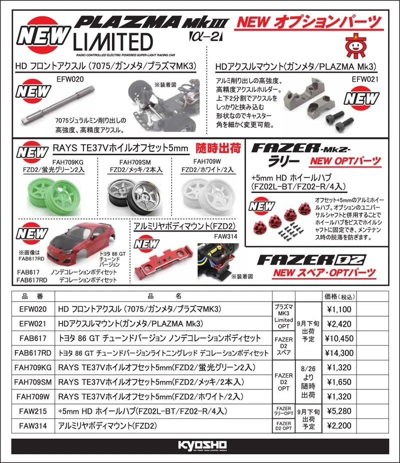 KYOSHO RC Information PLAZMA MK3 / FAZERシリーズ用 スペア & オプションパーツを発表