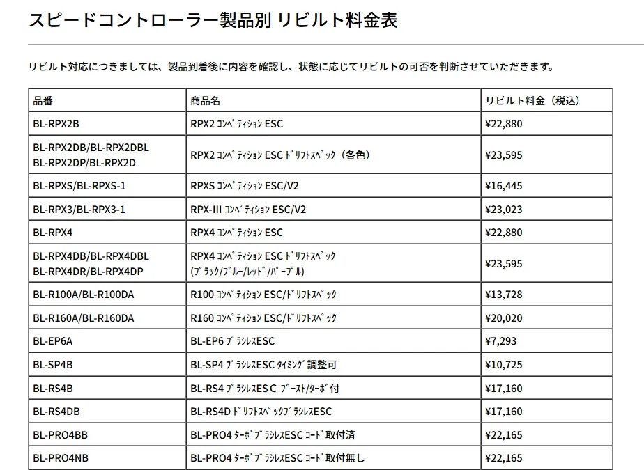株式会社ヨコモ スピードコントローラー製品別 リビルト料金表を公開