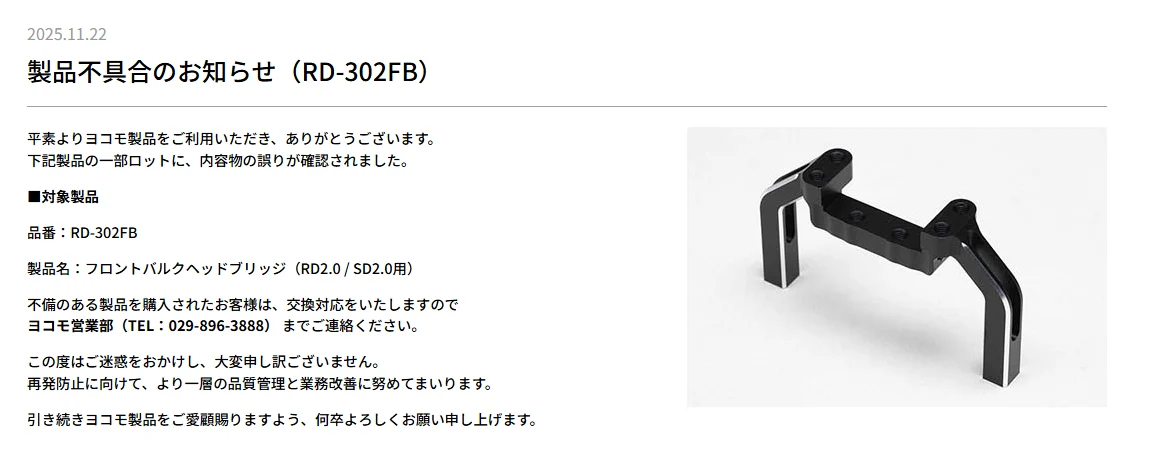 株式会社ヨコモは製品不具合のお知らせ(RD-302FB)を同社ウェブサイトに掲載した。