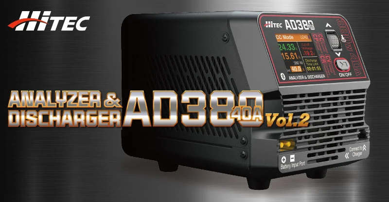 新型アナライザー兼放電器「AD380 Vol.2」は性能が飛躍的に向上しており、最大動作電圧を30Vから40.0Vへ、最大放電電力を180Wから380Wへと大幅に強化されている。本機は単体使用のほか、対応充電器と接続することでサイクル充放電が可能となる2 WAY Dischargeに対応しており、産業用途の電子負荷測定器に匹敵する4種類の放電モードを備えている。さらに、Bluetoothを介したスマートフォンアプリ「Hitec LinkPower X JPN Ver」での遠隔操作や、PCソフトウェア「Hitec Charge Master」を使用した詳細なバッテリー性能分析にも対応。