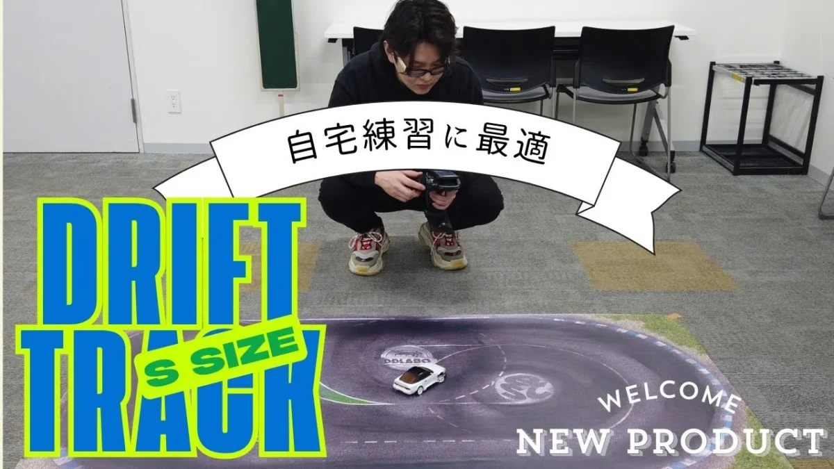 DDLABOドリフトトラックの新サイズについて紹介しています。既存のMサイズよりも大幅に小型化されたSサイズが登場し、日本の住環境でも使い勝手の良い畳一枚分のスペースで練習が可能になりました。素材の質感は維持しつつ、シリコンスプレー等で摩擦を調整することで、狭い範囲でも滑らかな定常円旋回や8の字走行を追求できる設計です。また、使用しない時はコンパクトに折りたたんで収納できるため、家庭での利便性が非常に高まっています。本格的なジオラマのような臨場感を自宅で手軽に体験できる、画期的な新商品として提案されています。