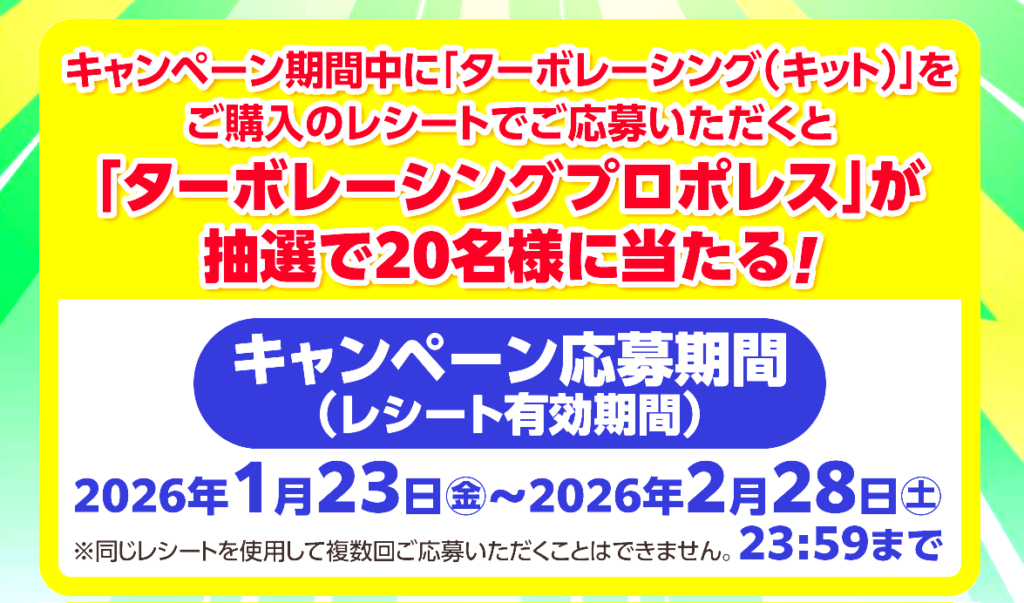 キャンペーン期間中にTURBO RACING(キット)をご購入し、応募期間(レシート有効期間)にご応募頂いた方の中から