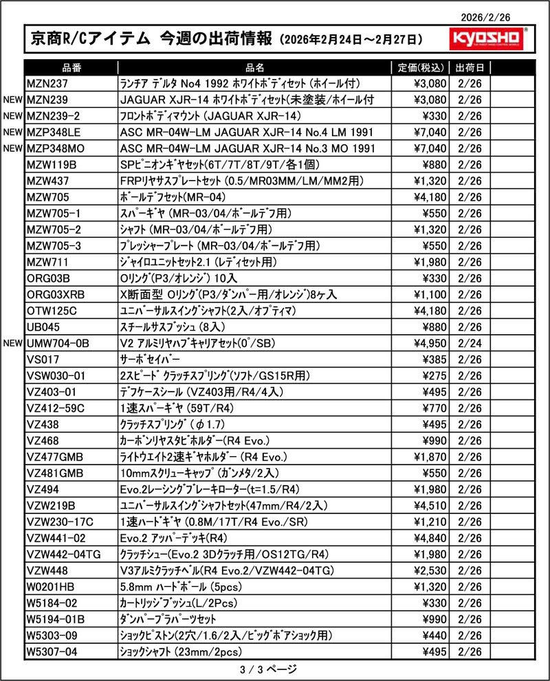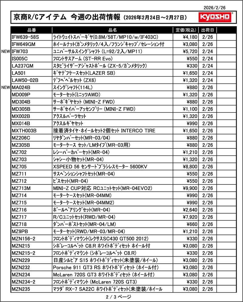 京商株式会社は「今週の出荷情報(2026年2月24日~2月27日)」を発表いたしました。